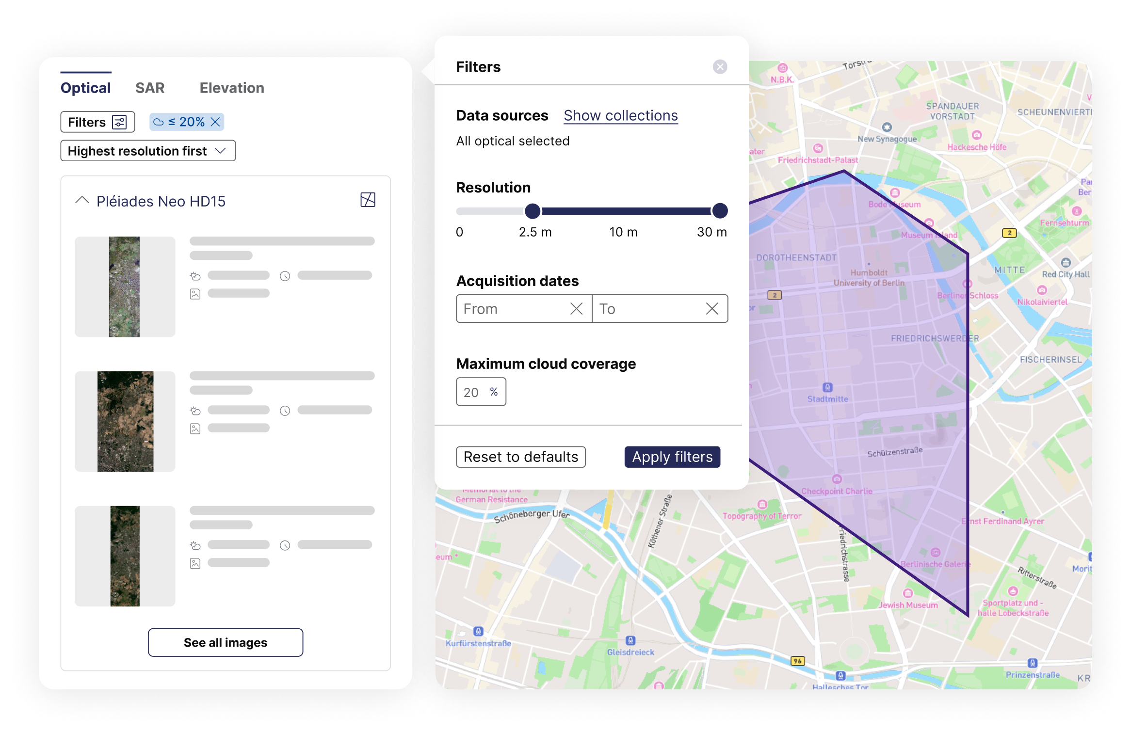 We introduced a clearer categorization of data types, allowing users to pick which types they’d like to work with, whether optical or SAR or something else. We also revisited the descriptions of available data products to make sure users know they’re ordering the right one.